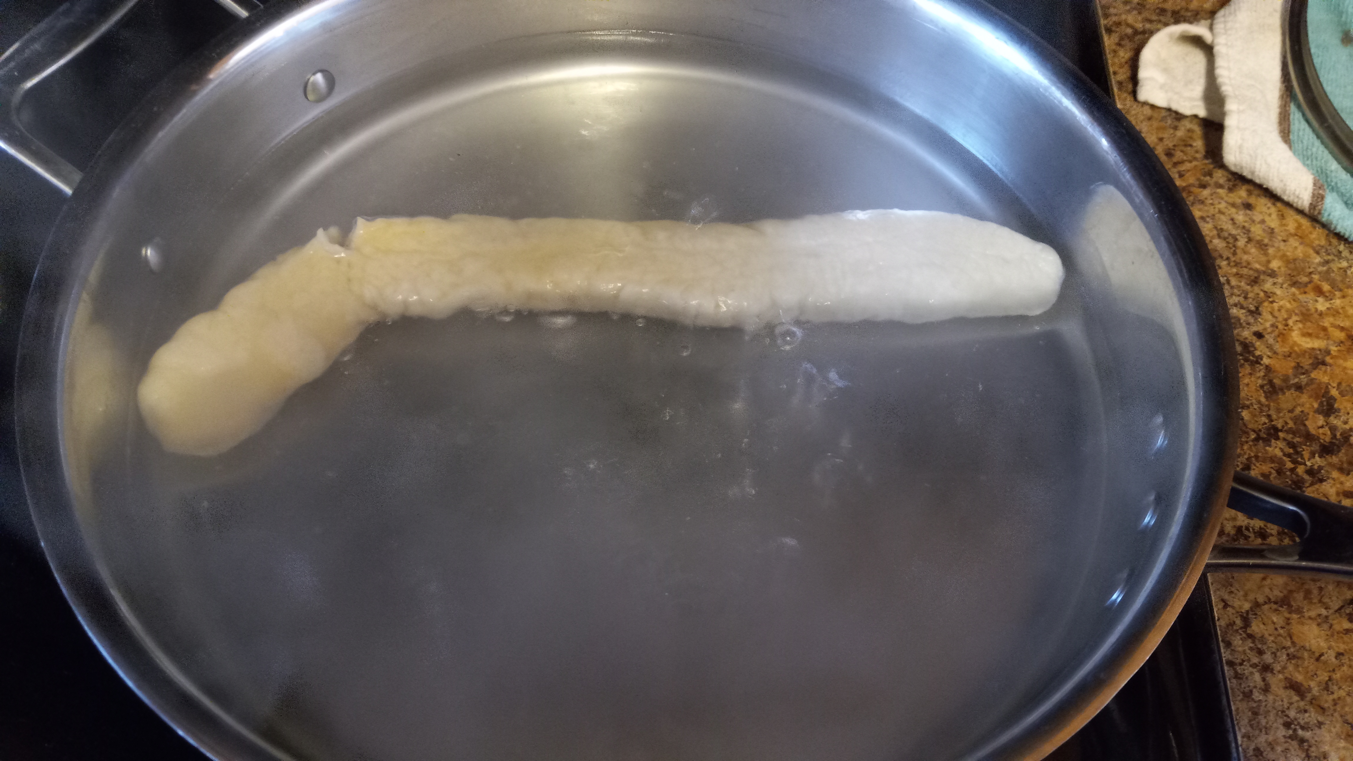 2. Bring water to boil, drop your bread sticks and dinner soup rolls into boiling water. Boil at 1 minute, flip, boil another minute. The longer boiling time, the crunchier the outside. (Go ahead and experiment up to 3 minutes boiling on each side, but be careful to watch out for cracking and separating on older doughs (if left longer than 2 days in the fridge). It will glue back together a little during baking.