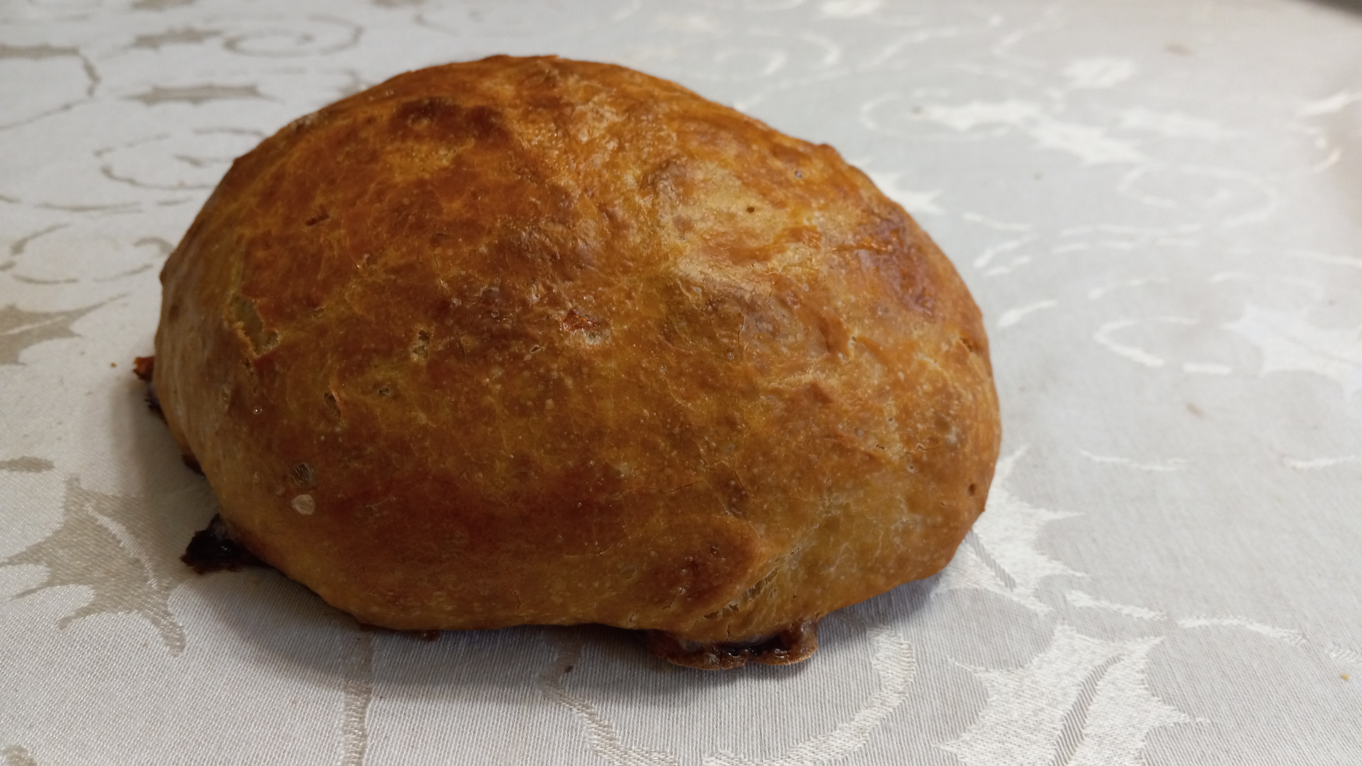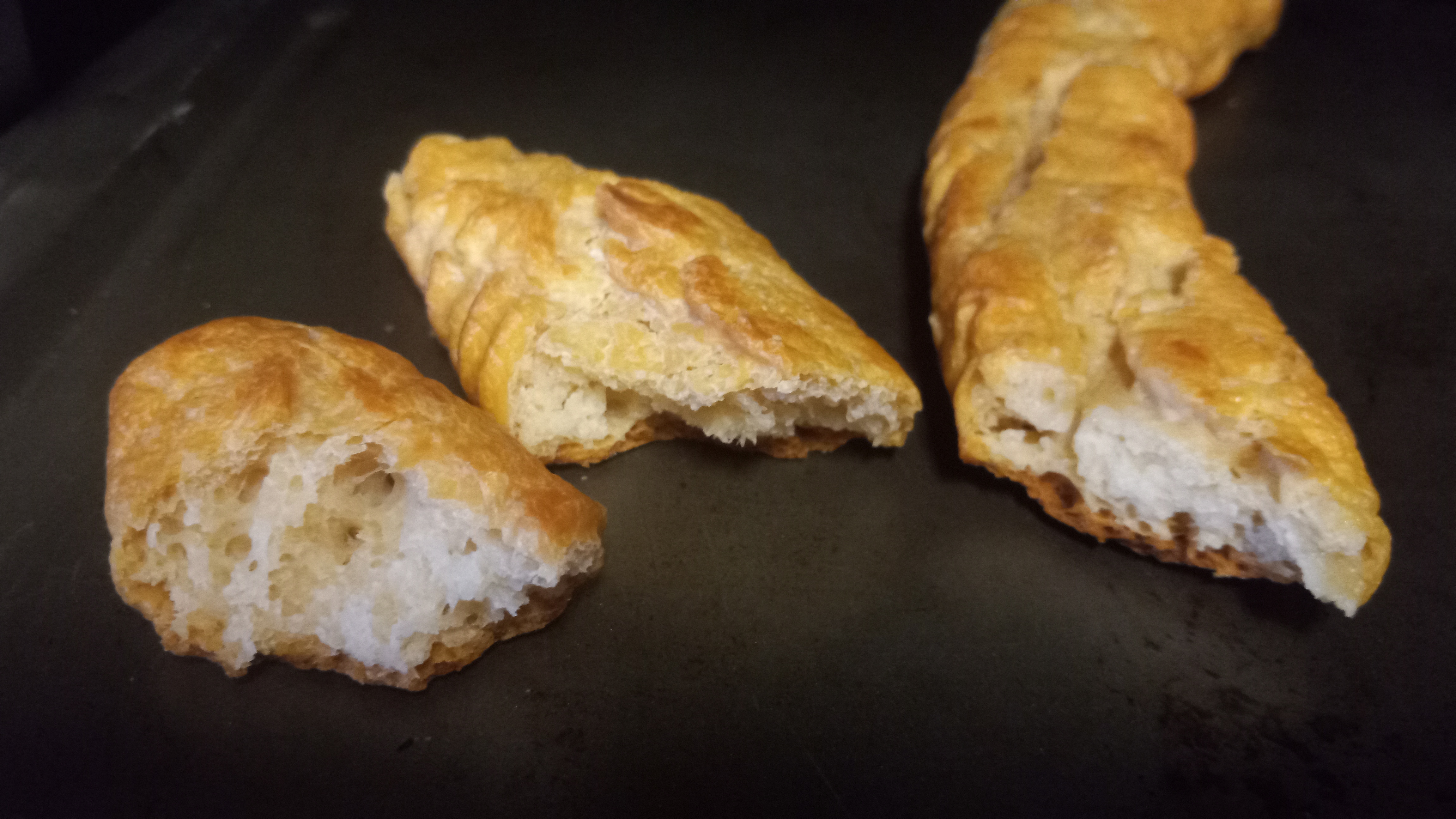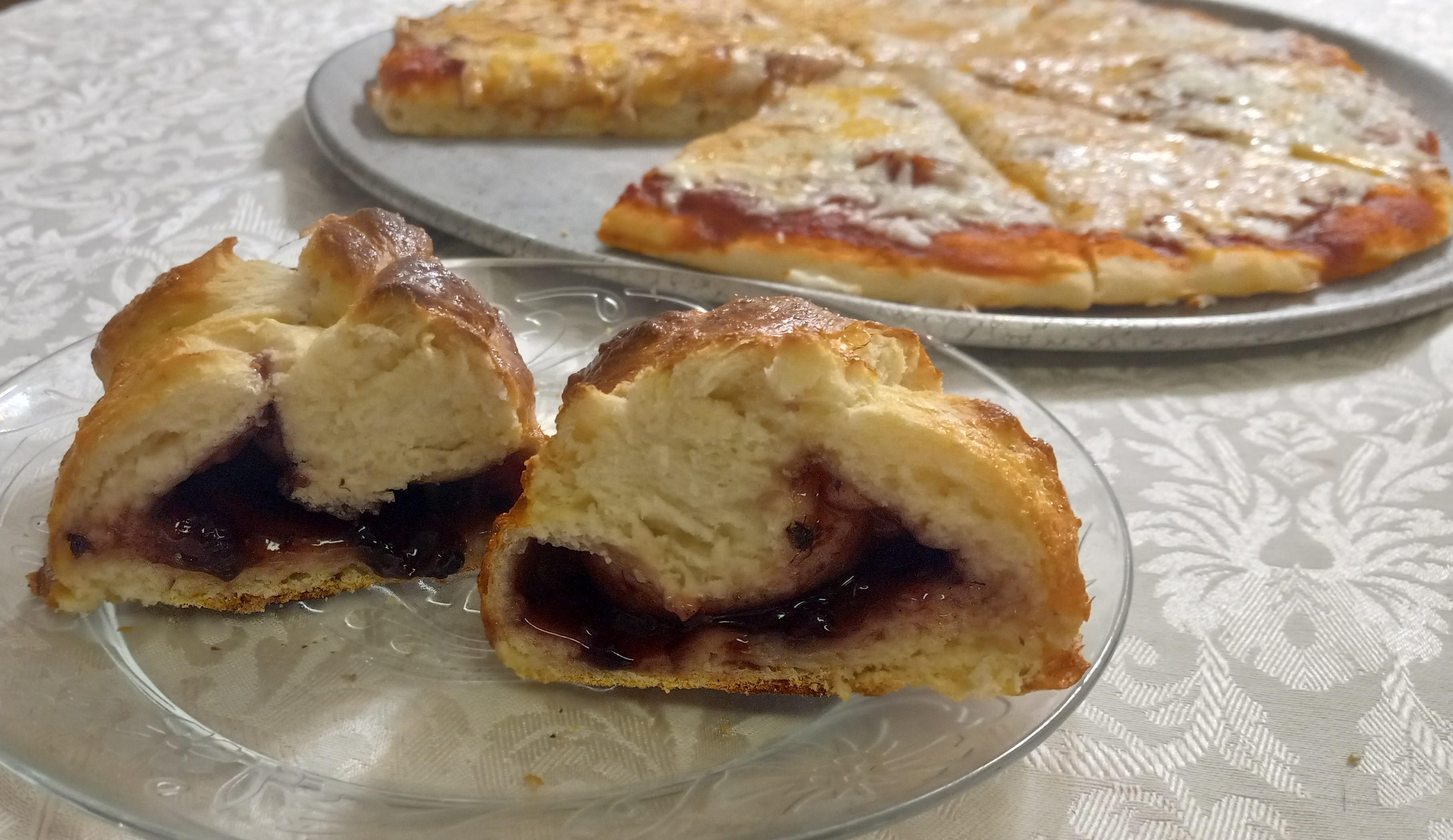 1. Preheat oven 350F. Roll dough to 1/4 inch thick circles approximately 6 inches in diameter. Place filling in the center and seal edges after folding in half (forming D-shape). If filling is runny, add flour or cornstarch to jelly or jam. You can stuff dry fruits and berries, cream cheese with powdered sugar, pumpkin with cinnamon, etc. Do not overfill to prevent tearing when wrapping.