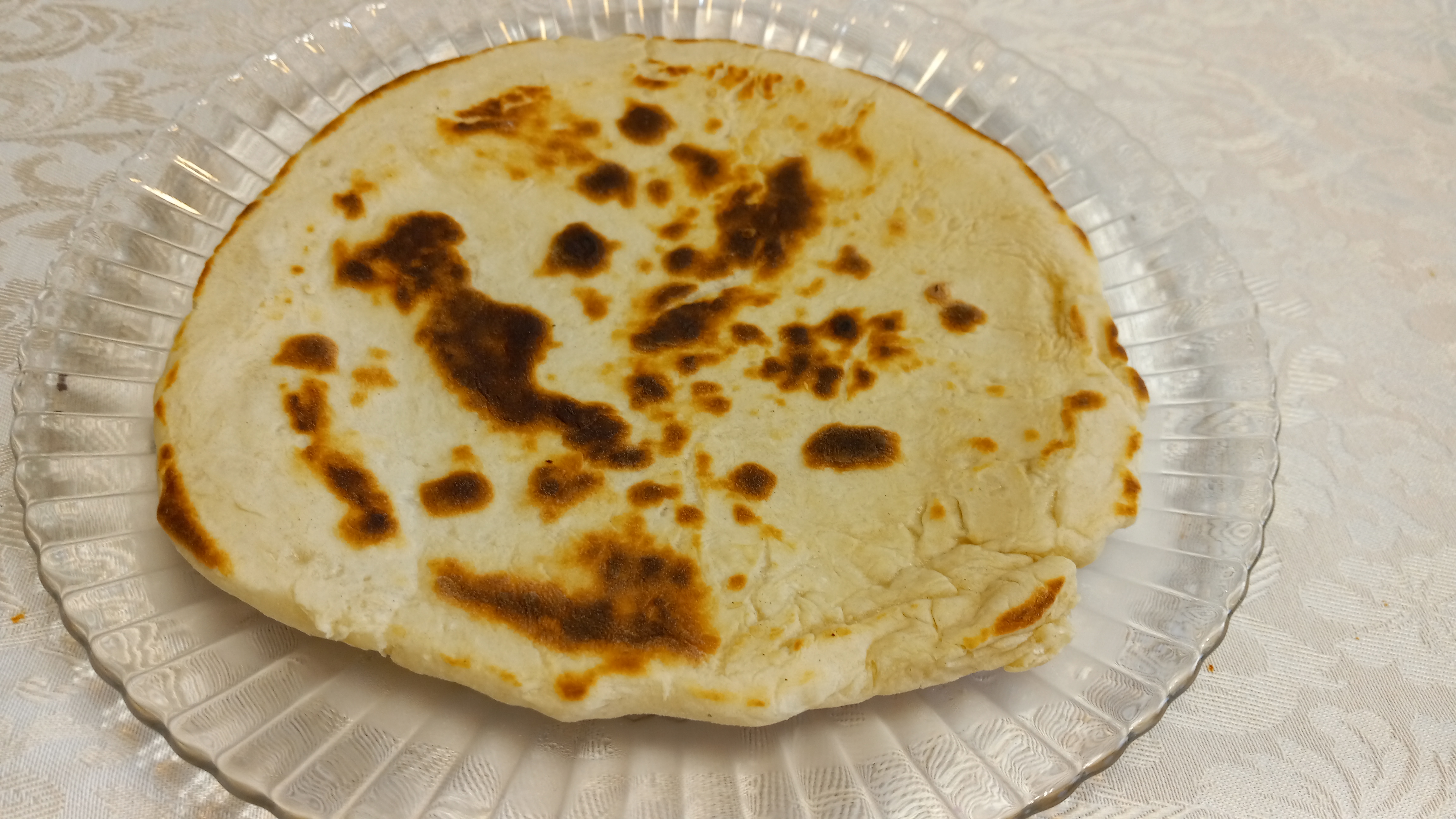 Roll out to 1/4 inch circles, preheat non-stick frying pan to medium heat, fry without oil on each side flipping over after 30 seconds several times until desired browness achieved.